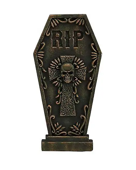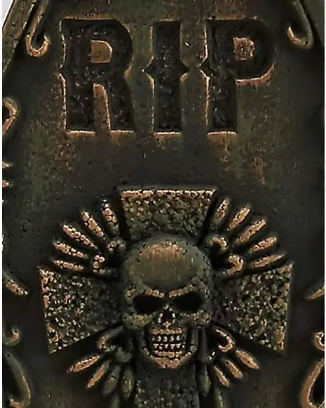When this spooky stone finds a place in your graveyard, you’ll have the most haunted house on the block! This bronze tone tombstone features a cross and skeleton design that looks just like real stone! It’ll be an excellent undead addition to any Halloween display! Not only will this tombstone add a haunting effect, but it also features new and improved higher quality stake, which will allow it to stay in the ground and firmly in place for any spooky graveyard scene!